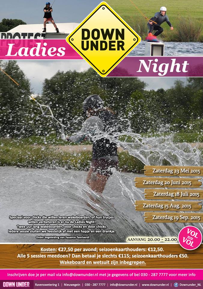 Alle dames en meisjes die willen leren wakeboarden of willen werken aan tricks kunnen aankomende maanden terecht bij Down Under. Van mei tot en met september wordt er elke maand een speciale ladies-night gehouden op zaterdagavond van 20:00 tot 22:00 onder begeleiding van wakeboardster Yasemin Tanriverdi. Voor slechts 27,50 per avond kun je meedoen aan deze clinics, inlcusief materiaal, en als je alle vijf de avonden meedoet betaal je slechts 115. De avonden worden afgesloten met een hapje en een drankje. Er zullen verschillende thema-avonden plaatsvinden, zo zal er in ieder geval één avond een pro-wakeboardster aanwezig zijn, worden er videos gemaakt en geanalyseerd, is er een fotoshoot, verkleedsessie, beach boy avond en op de laatste avond een competitie voor de deelnemers. Een of meerdere avonden zal ook hét dameswakeboard van dit moment te testen zijn: het Jobe Grace wakeboard. Deelnemers aan de clinic kunnen deze met korting aanschaffen bij WakeboardOnline. Bekijk hier de data en meer informatie. Aanmelden kan via [email protected].
